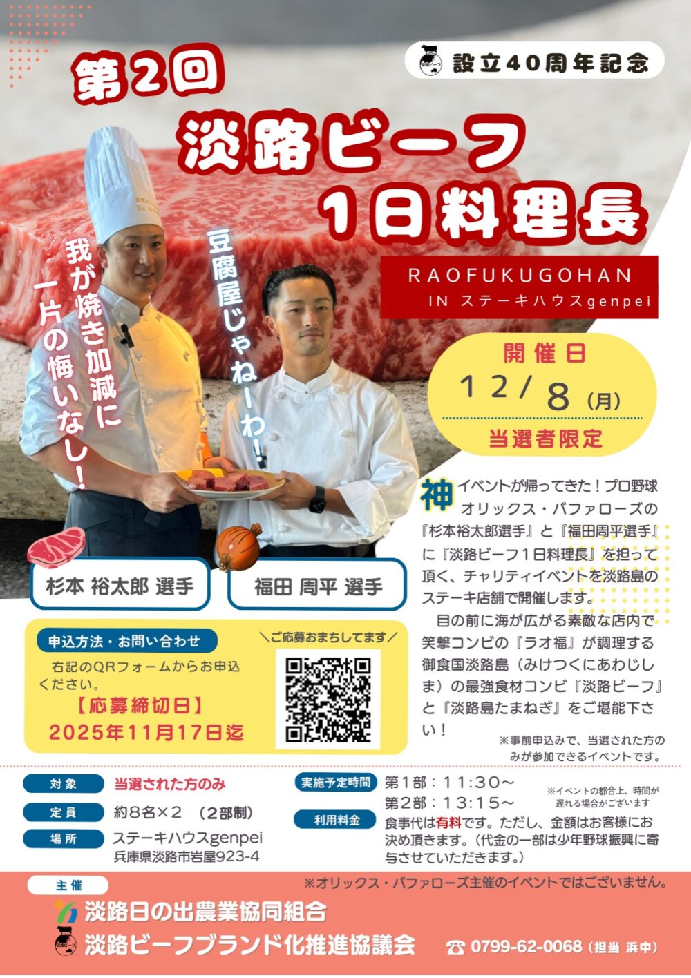 淡路島のブランド牛『淡路ビーフ』と『淡路島たまねぎ』をアピールしようと、プロ野球オリックス・バファローズの『杉本裕太郎選手』と『福田周平選手』が淡路市岩屋の『ステーキハウスgenpei』で1日料理長となり、実際に調理しファンをもてなすイベントが開催されます。
