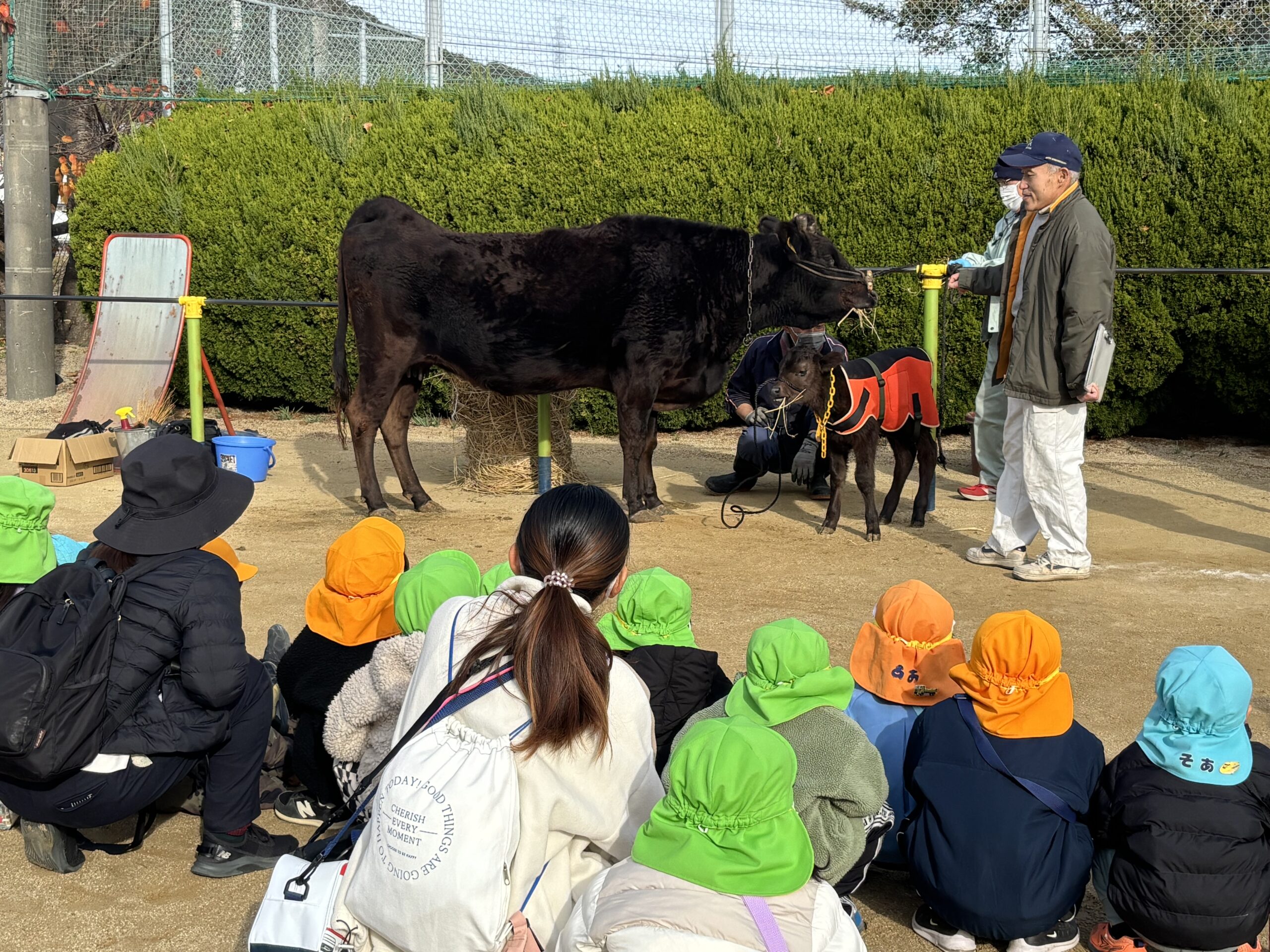 地元の子供たちに体験を通じて牛を身近に感じてもらうために、『地産地消給食の日』に小学校に親子の牛を連れて行きました。